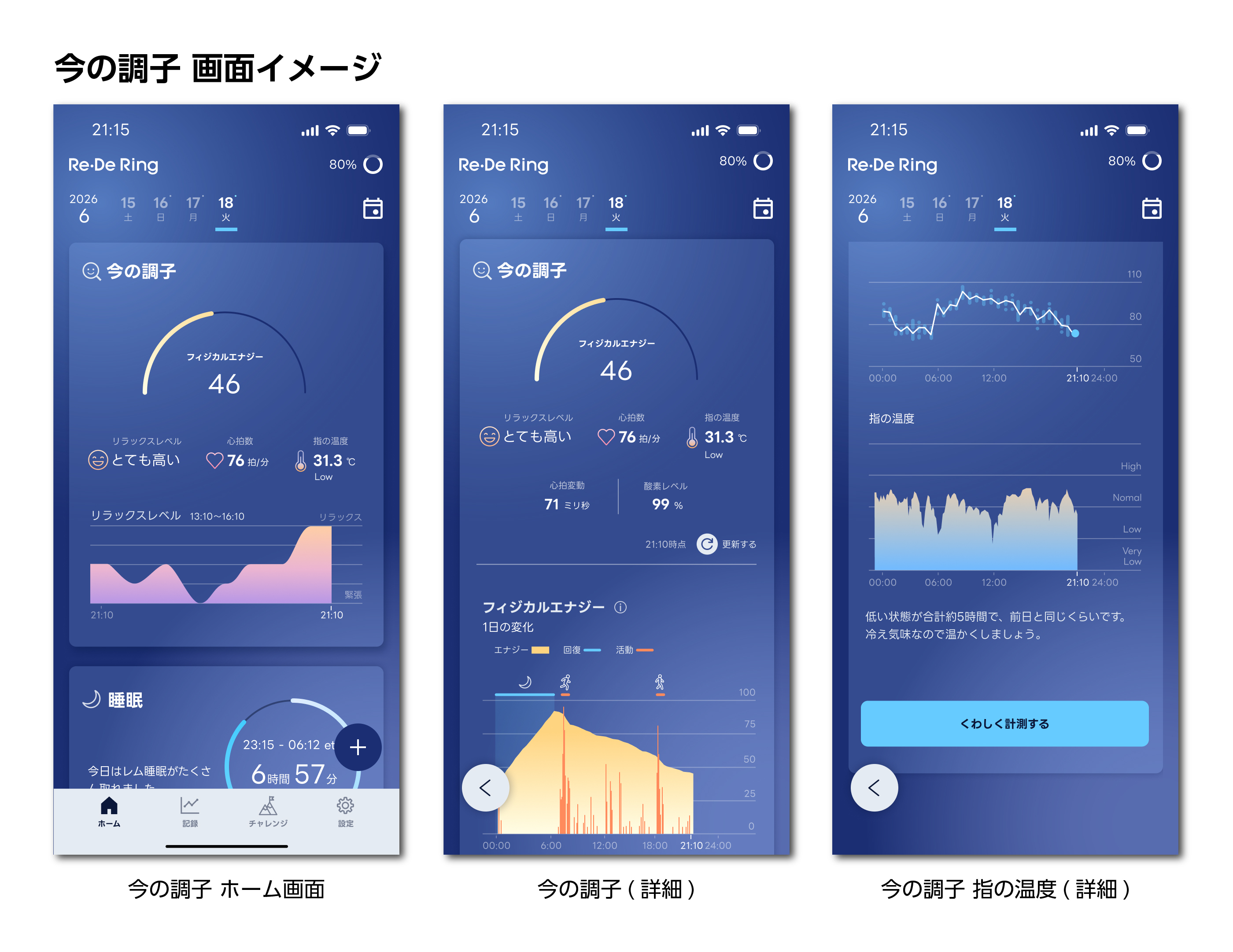 Re・De Ringは、単に睡眠や活動量を記録するデバイスではなく、毎日のコンディションを知り、自分らしく心地よく過ごすためのパートナーでありたいと考えています。
