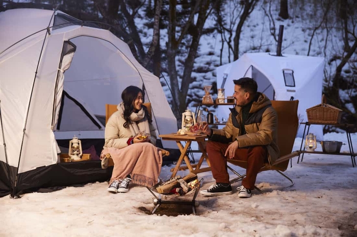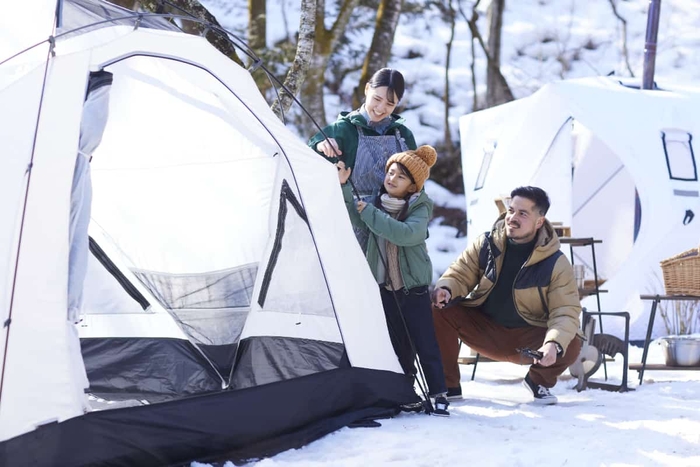 日本初のアグリツーリズモリゾート「星野リゾート リゾナーレ那須」では、2023年1月6日~3月11日の期間、冬のキャンプをファミリーで楽しむ「アグリキャンプデビュープラン」を販売します。アグリキャンプとは、田んぼや畑がある当リゾートで楽しむ、自然や農作物を活かしたキャンプのことです。スタッフと一緒に、ご家族でテントの組み立てや火おこしなど、キャンプに必要なスキルを習得します。テントは、滞在中いつでもキャンプを楽しめるように、客室の目の前に設置します。焚火を使って、玄米茶づくりに挑戦したり、朝食は習得したスキルをつかい野菜のスープを温めて仕上げたりします。また、茄子やカボチャなど農作物をテーマにしたサウナアイテムやドリンクを用意したアウトドアサウナ「アグリサウナ」もキャンプサイト内に設置。サウナで温まった後は、氷点下にもなる森の中で外気浴を楽しみます。冬の那須の自然を楽しむプランです。