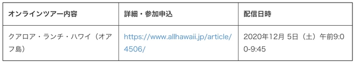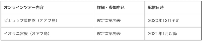 *上記プログラム内容は、2020年11月13日時点の内容です。今後、配信日時や追加ツアーが決まり次第公式ポータルサイトallhawaii内にて随時更新します。