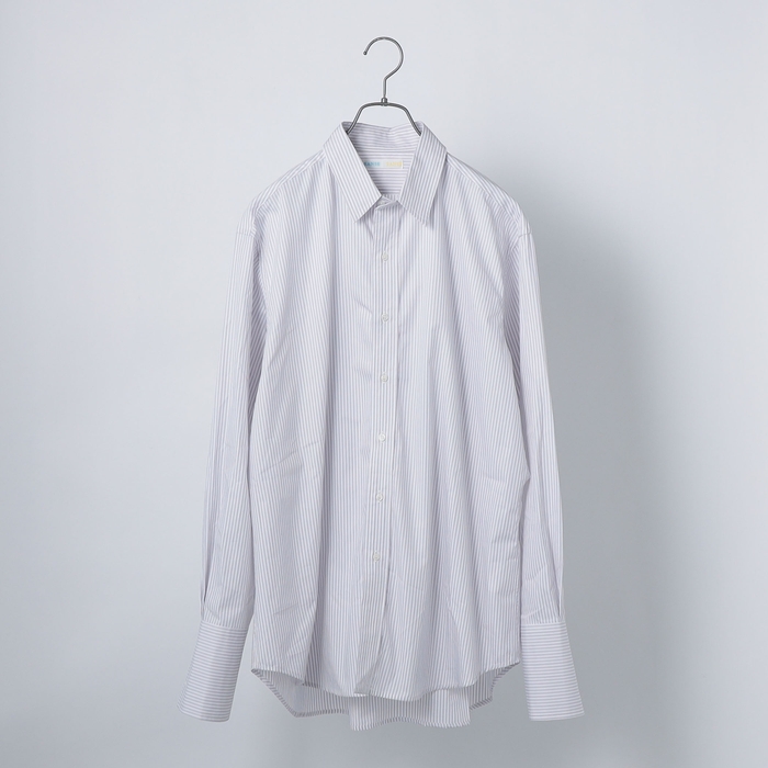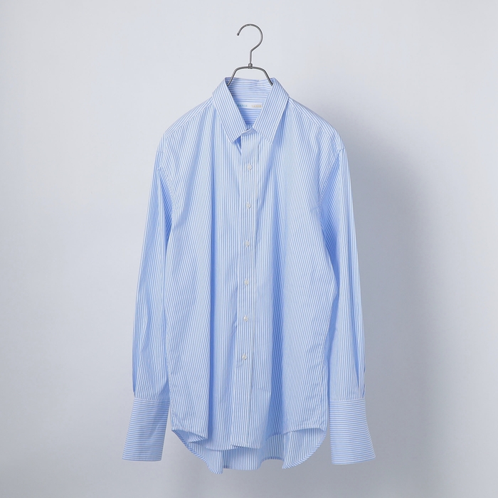 ダブルカフス仕様にあえて袖口のカフスボタンを外したストライプシャツ。カフスボタンを付けずに袖丈を長めにしても、ざっくりとラフに折り返して着用しても、一枚でサマになります。ゆとりのあるサイズ感ですが、あえて大きめに着て、女性も楽しめます。