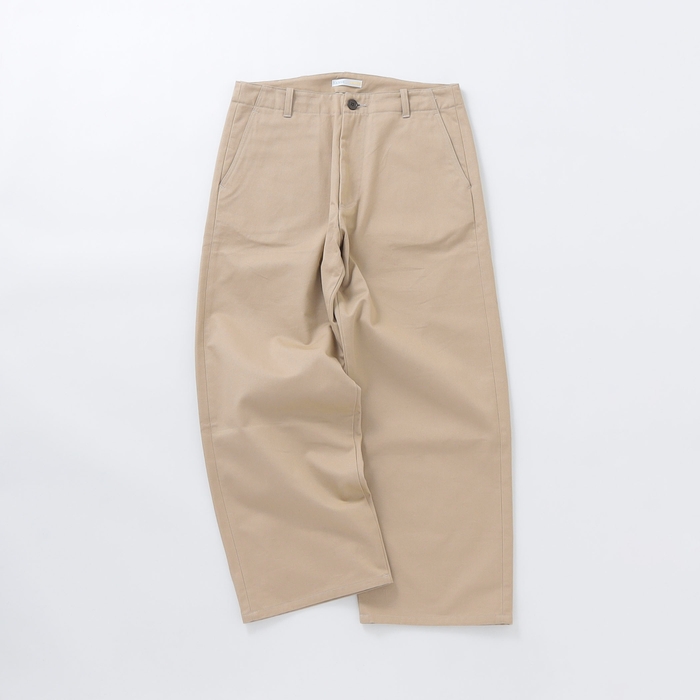 オーセンティックなチノパンをボリュームのあるワイドシルエットにすることで、クラシックながらも現代的な雰囲気に仕上げました。今を感じるワイドシルエットながらもすっきりとしたストレートにして、またクリアな表情を持つ素材を使用することできれいめなスタイリングでも着こなせる、幅広いシーンで活躍してくれるチノパンです。