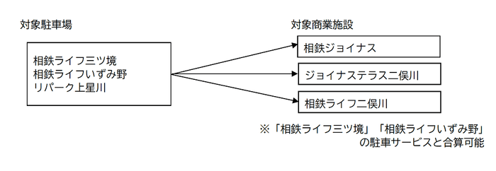 対象商業施設は従来の「相鉄ジョイナス」に加え、「ジョイナステラス二俣川」「相鉄ライフ二俣川」を追加。また対象駐車場は「相鉄ライフ三ツ境」「相鉄ライフいずみ野」の各駐車場に加え、「リパーク上星川」を追加し、お客さまのさらなる利便性向上を図ると共に、二酸化炭素の排出量を削減します。