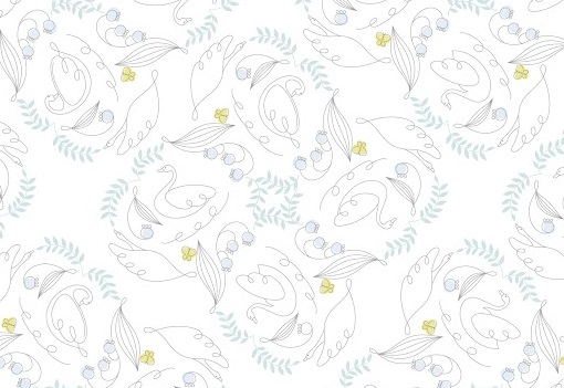 国産ガーゼアイテムに「スワン」のテキスタイルが登場。すずらんが咲き、朝露がおりる湖畔の芝生で、白鳥たちがお話をしている様子を描きました。みんなで使える優しいスワン柄のデザインです。