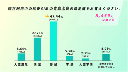 格安SIMの電話品質に関する満足度についてのアンケート回答では、「普通:47.44%」がもっとも多く、「満足:27.78%」「大変満足:8.64%」という結果になりました。