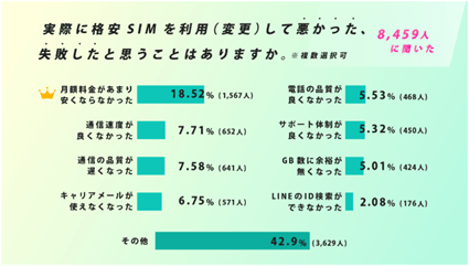 最後に、格安SIMを利用して悪かった、失敗したと思ったポイントについてもアンケート調査を実施。「月額料金があまり安くならなかった:18.52%」がもっとも多く、「通信速度が良くなかった:7.71%」「通信の品質が遅くなった:7.58%」が続きました。