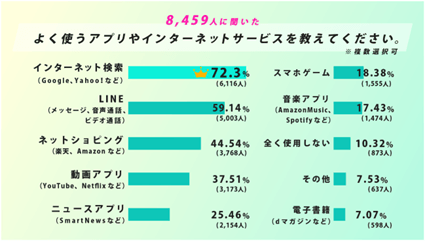 よく使うアプリやインターネットサービスについて、複数回答可のアンケート調査を実施しました。もっとも多かったのは「インターネット検索」で72.3%、続いて「LINE」が59.14%、「ネットショッピング」が44.54%となりました。ほかにも「動画アプリ:37.51%」「ニュースアプリ:25.46%」など、日常生活のさまざまな場面でアプリやインターネットサービスを利用している様子がうかがえます。