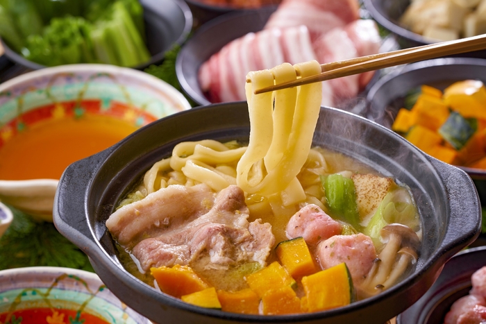 平らな「ほうとうめん」をたっぷりの具材とともに煮込んだほうとうは、山梨県を代表する郷土料理。