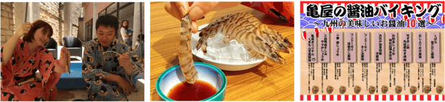 ◆香ばしい香りもご馳走な「串焼き」の他に、新鮮だからこそ楽しめる「踊り食い」もお薦めです。レストランでは九州産をはじめとした10種類もの醤油を取りそろえた「醤油バイキング」をご用意していますので、お好みを見つけて踊り食いをご堪能いただけます。