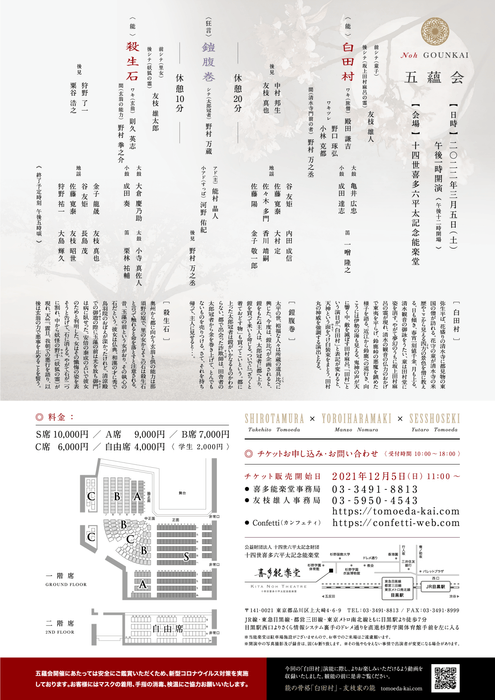 友枝雄人主催による『五蘊会』が2022年3月5日 (土)に十四世喜多六平太記念能楽堂(東京都品川区)にて上演されます。チケットはカンフェティ(運営:ロングランプランニング株式会社、東京都新宿区、代表取締役:榑松 大剛)にて発売中です。