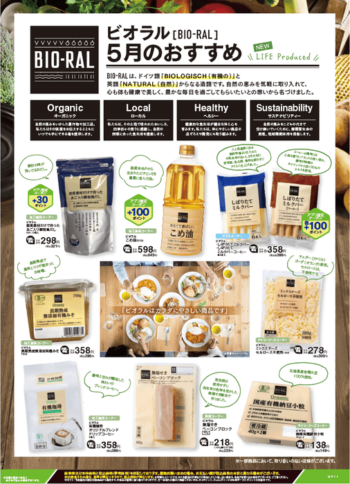 “おいしい” “ワクワク” “ハッピー” をお届けするライフコーポレーションは、健康志向のお客様におすすめしたいBIO-RAL(ビオラル)商品を、毎月お試し価格にて販売いたします。5月のおすすめは9品。その中より「国産有機納豆小粒」「長期熟成無添加有機みそ」「有機珈琲オリジナルブレンド」「こめ油」の4品をご紹介いたします。