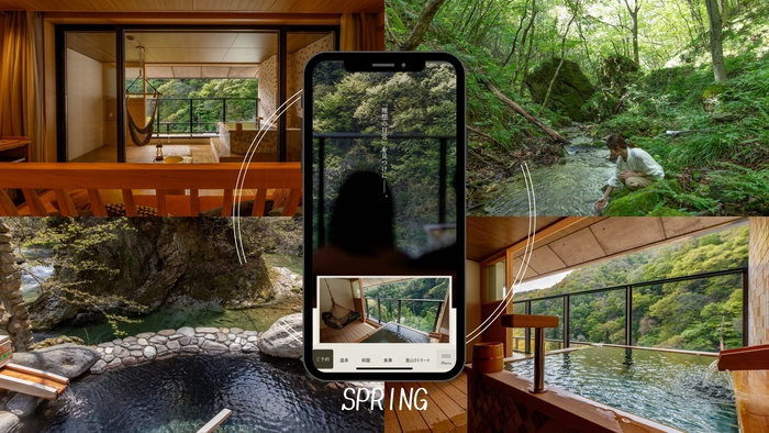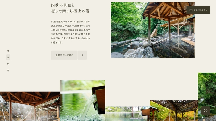 豊かな里山と清流広瀬川を眼下に望む「広瀬川源流露天風呂」など、五感で季節を感じ、自然と深呼吸したくなる温泉リゾートの「四季」を紹介しています。