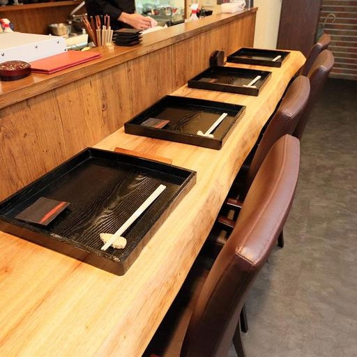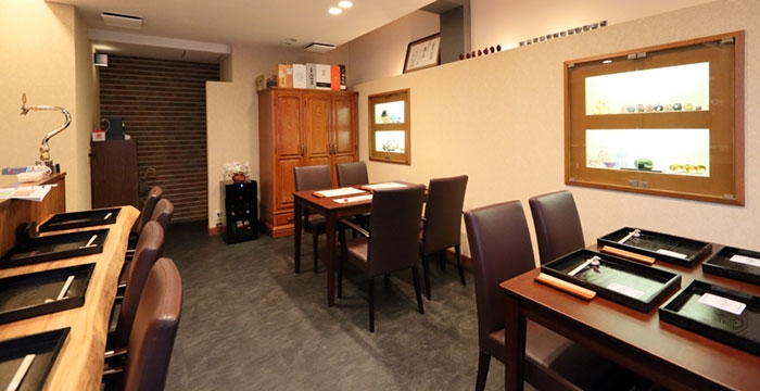 割烹料理店と聞くと敷居が高いようにも感じてしまいますが、『饗応 元』はとてもアットホームなお店です。外観は一見すると洋食店のようにも見える建物で、中は温かみのある暖色系の照明に、木を基調としたインテリアでカジュアルな雰囲気さえ感じます。カウンター席、テーブル席が2つと席数はあまり多くありませんが、静かで落ち着きのある空間です。そんな中でゆったりと料理を堪能することができますよ。