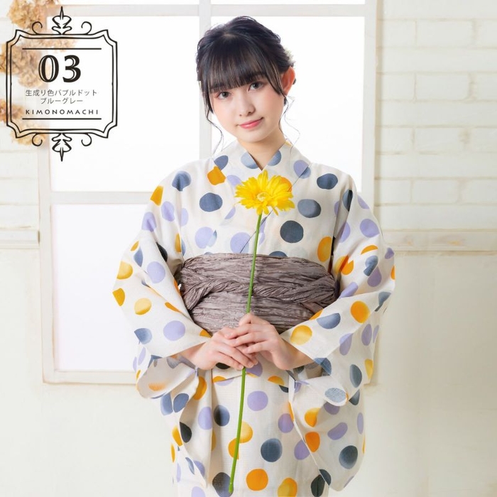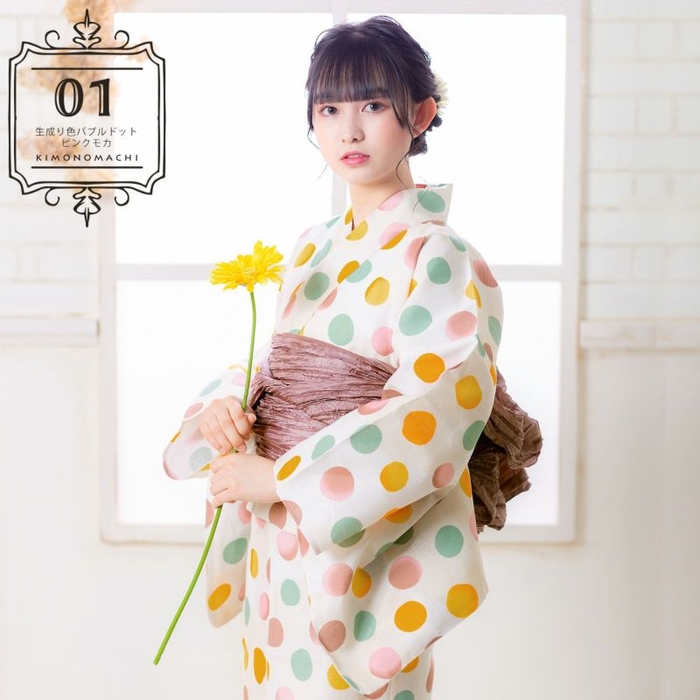 浴衣:生成り色バブルドットピンクモカ…淡い生成り色の地に、ランダムな水玉模様。深い山吹色に淡黄色のぼかしや、浅いピンクに茶、淡い青磁色。手描き調のやわらかな形がかわいらしく、シックな色彩が大人びた印象にしてくれます。