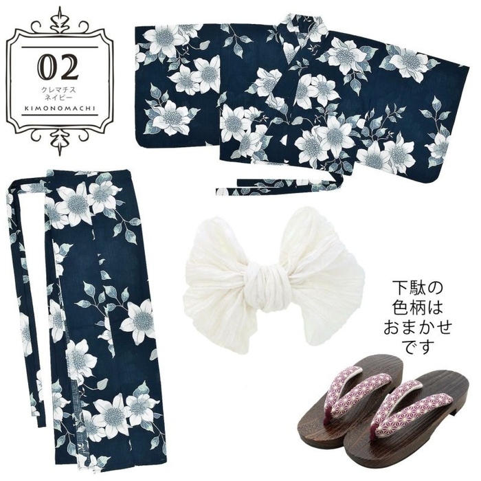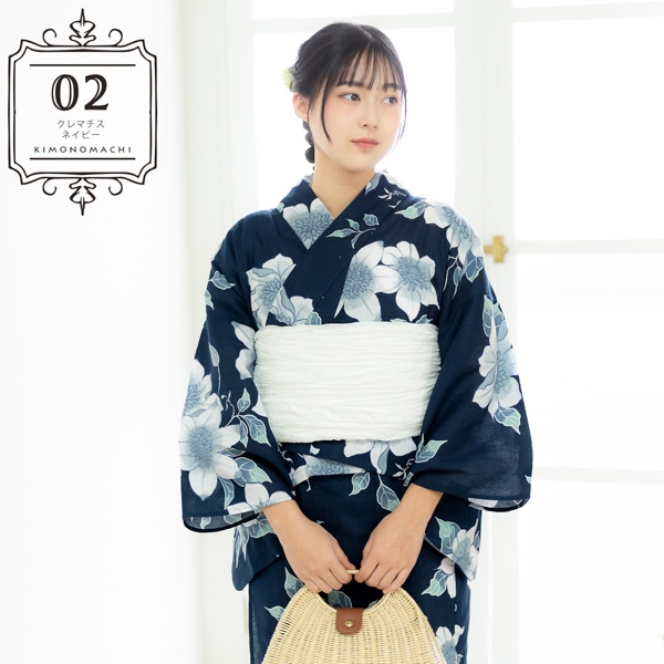 浴衣:深いネイビーの地。紺色の輪郭線で表された白にブルーグレーのクレマチスの花。白い輪郭線に青灰色と薄緑の葉。レトロな柄行と古典的な色遣いが魅力の浴衣です。