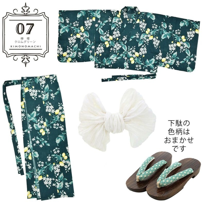 浴衣:暗めの青緑色の地に、花や実をつけたレモンの柄。浅い青緑と白緑色のぼかしの葉。白と淡いグレーの花。明るい黄色、白のつややかな実。レモンの瑞々しさを感じさせるデザインが、新鮮な魅力を放ちます。