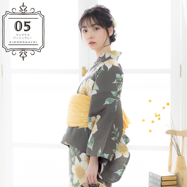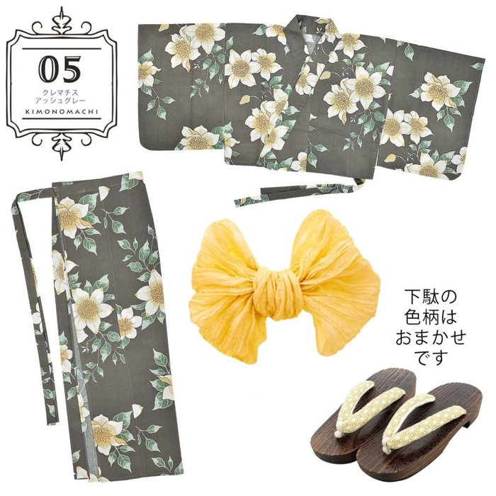 浴衣:わずかに緑みのグレーの地。茶色の輪郭線で表された生成り色に淡い黄色のクレマチスの花。白い輪郭線にくすんだ緑と薄緑の葉。レトロな柄行と現代的なカラーが魅力の浴衣です。