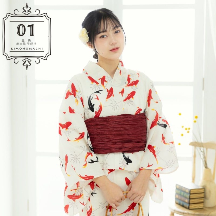 浴衣:浅い生成り色の地に、グレーの水草、赤と黒の金魚の柄。金魚鉢を上から見ているかのようなデザインです。赤い金魚はヒレの先などに黄色のぼかし、黒はグレーのぼかし。色の変化がアクセントとなっています。曲線を描く水草の間を、和金のようなすっきりとしたシルエットの金魚が泳ぐ、大人にオススメの金魚の浴衣です。
