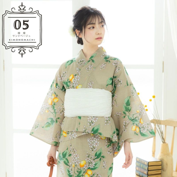 浴衣:グレイッシュな鈍いベージュの地に、花や実をつけたレモンの柄。ハッキリとした深い緑と白緑色のぼかしの葉。白と淡いグレイッシュなピンクの花。あざやかな橙色、黄色、白のつややかな実。いきいきとしたレモンのデザインが、爽やかさと明るさを感じさせるデザインです。