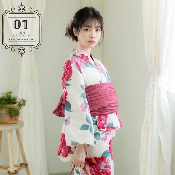 浴衣:アイボリーの地にピンク色と濃ピンク色、赤みのピンク色、白にピンク色の絞りの入った椿の花。青磁色と緑の葉。ところどころかすれたような色合いと、輪郭線のない表現がレトロでかわいらしい雰囲気です。