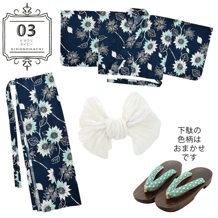 浴衣:紺地に白抜きのヒマワリ。淡いミントブルーのぼかし。レトロな手描き調のタッチが可愛らしく、茎を繋げたデザインが動きを生み出しています。