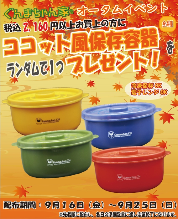 ぐんまちゃん家1階店舗にて、税込2,160円以上商品をお買い上げの方に、ぐんまちゃん家オリジナルの「ココット風保存容器」を1個プレゼント!