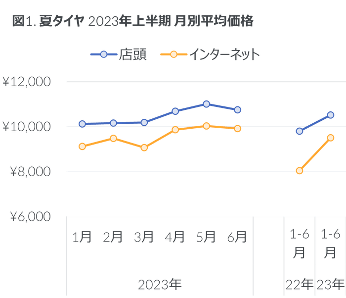 2023年上半期の数量前年比は5%減と微減であった。夏タイヤでは4月のメーカー出荷価格引き上げ前の特需はあったものの、前年ほどの盛り上がりを見せるには至らず、店頭では数量前年比7%減、インターネットでは同10%減とともにマイナス成長であった。出荷価格が引き上げられたことに伴い、店頭の平均価格は前年から7%上昇し10,516円、インターネットでは18%上昇し9,512円となった(図1)。この結果、金額前年比は店頭では前年並みに留まり、インターネットでは7%増と堅調に推移した。