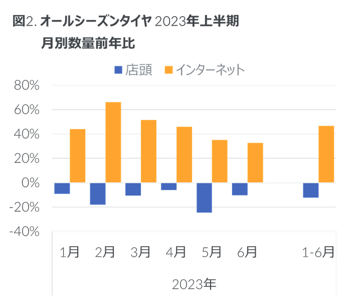 近年販売が増加しているオールシーズンタイヤは数量前年比21%増と二桁成長を見せた。店頭、インターネット別にみると、インターネットでは47%増と大きく伸長したものの、店頭では12%減と販売を落とした(図2)。