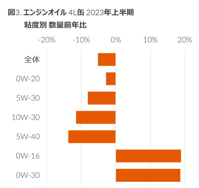 ・ エンジンオイル4L缶は数量前年比5%減のなか、粘度別に0W-16、0W-30はともに数量前年比19%増と大きく伸長した。