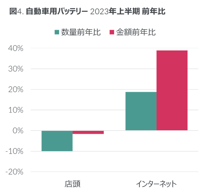 ・ 自動車用バッテリーは店頭の数量前年比が10%減と落ち込む中、インターネットでは同19%増に至った。