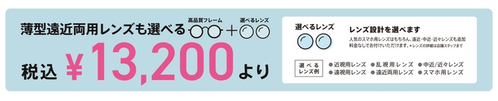 選べるレンズ付 メガネ1組¥13,200(税込)より、薄型遠近両用レンズ、中近両用・近々両用レンズも選べます!