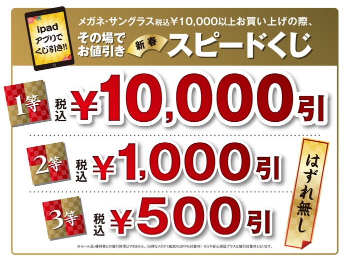 期間中メガネ・サングラスを税込¥10,000以上お買い上げで、スピードくじを1回引けます。1等¥10,000引きをはじめ、2等¥1,000引き、3等¥500引きをその場で値引きいたします!(ハズレなし)