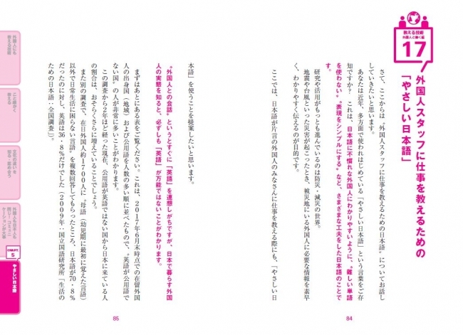そこで、職場での公用語は〝やさしい日本語”にしようというのが、本書からの提案です。彼らは職場の外では〝日本で暮らす生活者”。ですから職場での業務時間中に〝やさしい日本語”で日本語に慣れていけば、日常生活でも日本語がどんどんスムーズに使えるようになっていく、というメリットもあるでしょう。