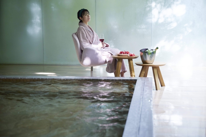 プラン特典として、早朝の貸し切り温泉で朝の贅沢な時間を過ごせます。目覚めたばかりの身体を温泉であたためた後、そばにある椅子に腰かけて、涼みながら楽しむのは、フローズンイチゴ。あわせて、シャンパンも用意するため、シャンパンに入れてイチゴシャンパンとしても楽しむことが可能です。朝からゆっくりとしたプライベート時間を堪能できる特典です。