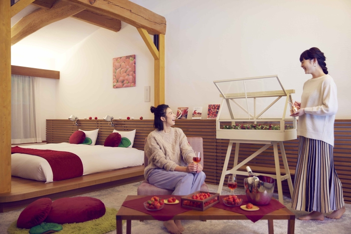 日本初のアグリツーリズモリゾート「星野リゾート リゾナーレ那須」では、2022年1月5日~3月15日の期間、1泊2日で旬のイチゴを満喫するプラン「イチゴフルステイ」を販売します。本プランの客室「イチゴスウィートルーム」には数種類のイチゴとコンディメントを用意。また、イチゴ専用のプランターがあり、世話をすることでイチゴを愛でます。早朝には、貸し切りの温泉でシャンパンとイチゴを楽しみ、出発前にはイチゴをふんだんに使用した「イチゴの石窯スイーツピッツァづくり」ができるプランです。