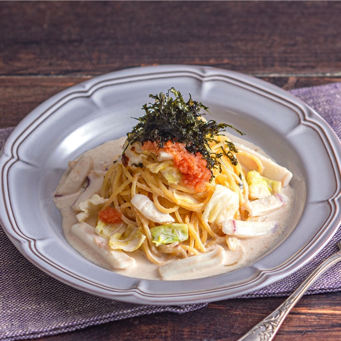 「一本槍イカと糸島キャベツの明太子クリームソース 海苔の香り」