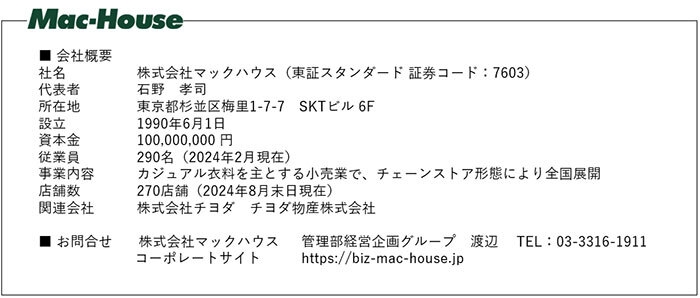 株式会社マックハウス(本社:東京都杉並区/代表取締役社長:石野孝司)は、メンズの定番ジーンズとして2022年の発売から累計12万本販売しているプライベートブランドNAVY「マイデニ」の品揃えを拡大し、レディースジーンズを新発売いたしました。お客様やスタッフの声を反映させ型紙や仕様を見直し、日本女性の体型に合わせた究極のシルエットと快適なはき心地のジーンズが誕生いたしました。