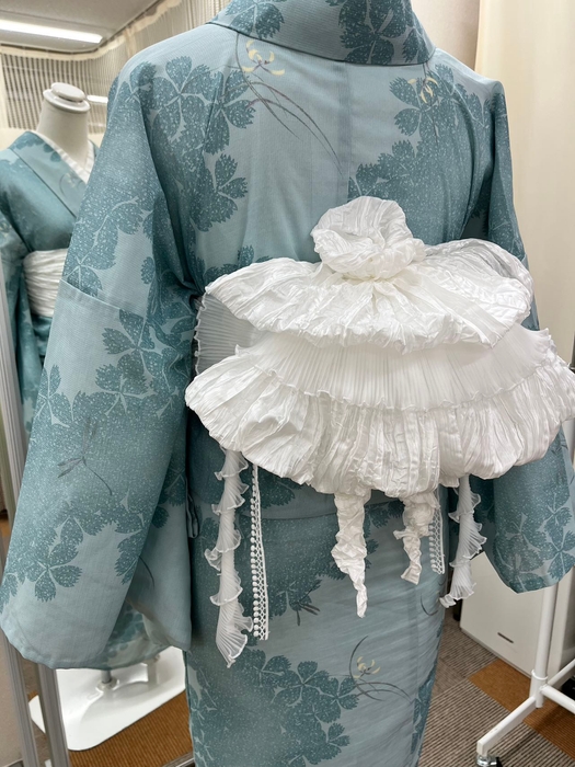 8月20日よりこのクラゲ浴衣にぴったりのキュートなオリジナルクラゲ帯結びをレース帯揚げとセットで1,100円でご提供します!浮遊感溢れる瑞々しく可愛いクラゲ帯結びをこの期間に試してみてください!