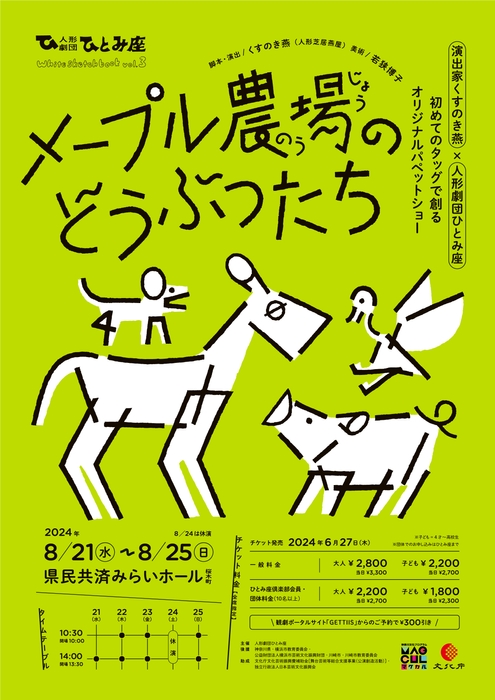 人形劇団ひとみ座主催、『メープル農場のどうぶつたち』が2024年8月21日 (水) 〜 2024年8月25日 (日)に県民共済みらいホール(神奈川県 横浜市中区 桜木町 1-1-8-2)にて上演されます。