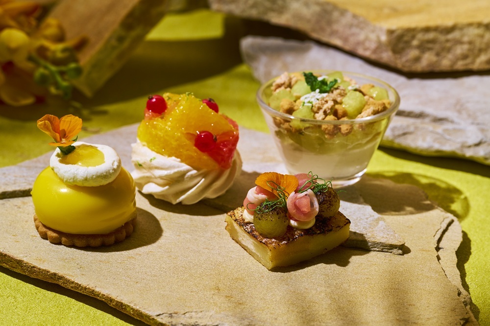 初夏のやわらかな陽光と、果実のきらめきを楽しむアフタヌーンティーが登場します。柑橘フルーツとメロンを主役に、瑞々しい果実をふんだんに使用したスイーツを揃え、明るく爽やかな初夏のティータイムをご用意します。オレンジと日向夏の酸味と甘みが広がる「オレンジと日向夏のムース」は、軽やかでなめらかな口当たり。鮮やかな黄色と丸いフォルムが可愛らしい一品です。「柑橘のパヴロヴァ」は、サクッとしたメレンゲに柑橘フルーツのソースを閉じ込め、果肉をトッピング。甘みと酸味が調和する爽やかな味わいと食感をお楽しみいただけます。また、ヨーグルトムースにフレッシュメロンをのせ、ライムやハーブの清涼感を合わせた「メロンとハーブのテラリウム」は、初夏の庭園を思わせる爽やかな色合いが魅力の一品です。季節感あふれるスイーツとともに、爽やかな果実の味わいが広がるアフタヌーンティーをぜひご堪能ください。