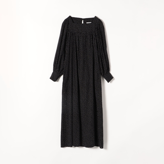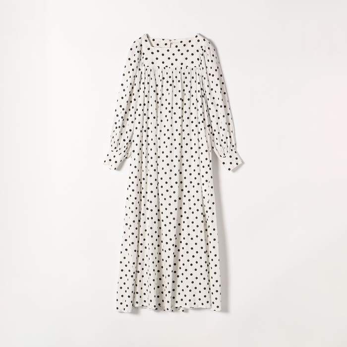 スクエアネックのデコルテラインが大人っぽくて女性らしいドット柄ワンピースです。コンパクトなヨーク切り替えからふわっと広がる袖と身頃の雰囲気と、メリハリのあるシルエットが相まって、大人な可愛いワンピースです。ストライプ状の凹凸感のあるドビー組織のソフトなコットン素材にドット柄プリントを載せることで、より奥行きと立体感のある印象とハンドクラフト感漂う温かみのあるアイテムに仕上がりました。袖をたくし上げてボリュームを出す着こなしや、秋にはブーツと合わせたりして季節ごとの着こなしを楽しめます。ご自宅でお洗濯が可能です。