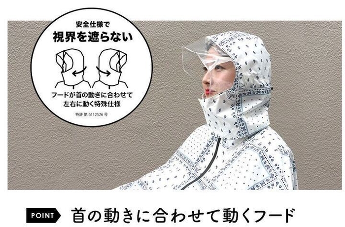 荷物が濡れないよう、レインポンチョを自転車のカゴにサッとかぶせて使うチャリーポンポン。首の動きに合わせてフードが左右に動く仕様なので視界を遮らず、安全に運転することができます。