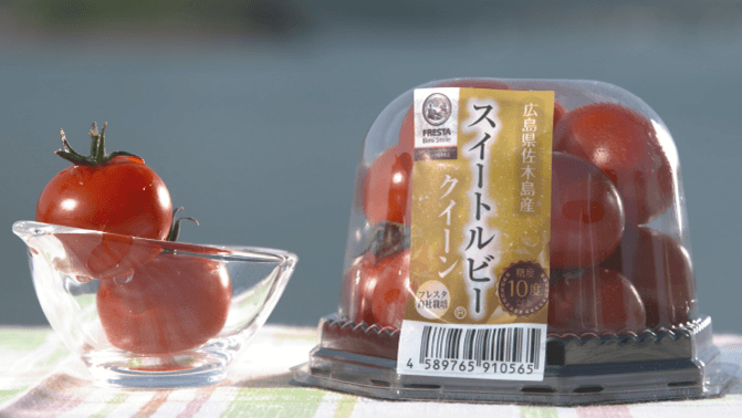 佐木島の広島アグリネットファームで作られている『スイートルビー』は、広島を中心に展開しているスーパーマーケット・フレスタのオリジナルブランドトマトです。“アイメック農法”という特別な方法で年間を通じて栽培されています。