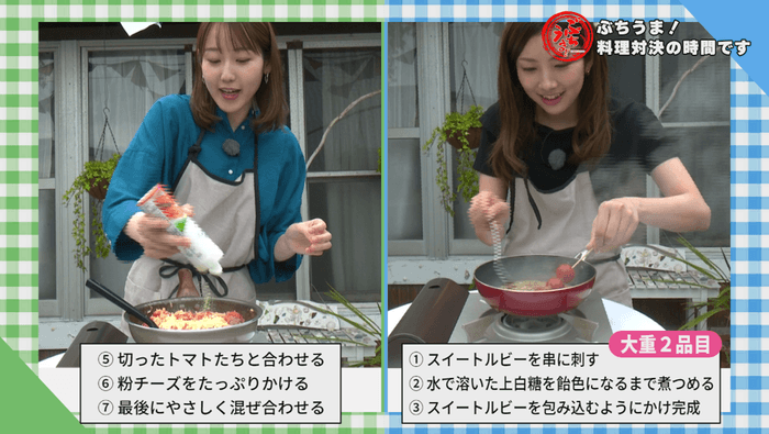 勝者だけが食べられるご褒美を目指し、フリーアナウンサーの大重麻衣と河村綾奈がクイズ&料理対決!