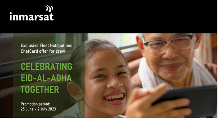 インマルサットは、船員の皆様にイード期間限定のFleet HotSpotとChatCardのキャンペーンを実施いたします。船員の皆様にとって、イード期間中にご家族やご友人と会話を楽しんだり、お祝いをすることが、いかに重要であるかをインマルサットは理解しており、特別に、2023年6月25日00:00(UTC)から2023年7月2日23:59(UTC)まで、Fleet BroadbandおよびFleet Xpress ChatCardの通話時間を33%延長いたします。