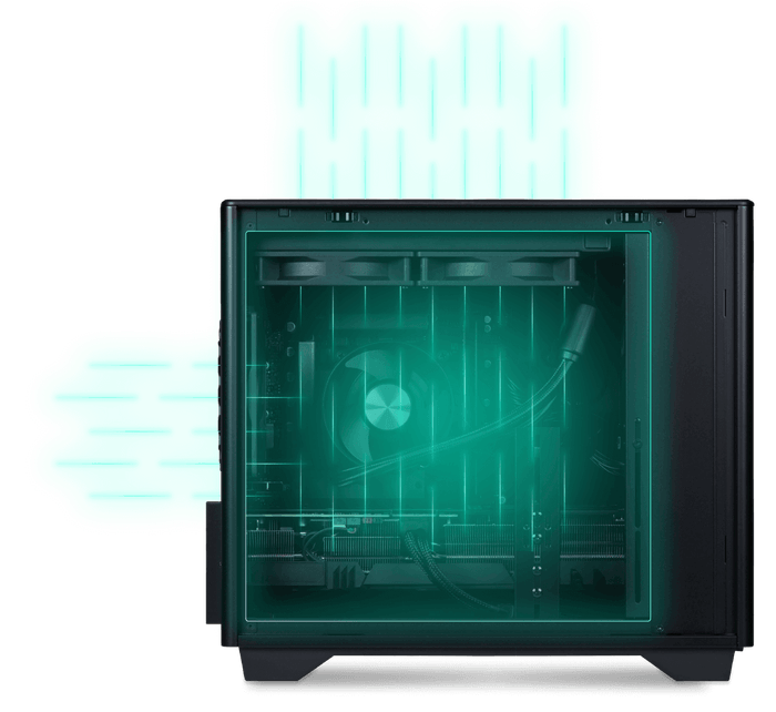 熱移動の理にかなった、底面吸気・上面排気の垂直エアフローレイアウトは、スムーズな熱の排気に繋がり、内部の温度上昇を抑えます。筐体の上面には120mmのケースファンを2基、あるいは240mmの水冷クーラーを搭載可能。背面と底面には120mmのケースファンを各1基設置することが可能となっており、システムの安定性と高いパフォーマンスを発揮させます。