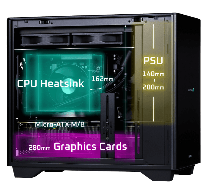 ミニタワーサイズの筐体は長さ280mmまでのグラフィックカードを搭載可能。大型グラフィックスカード搭載時には、しっかりと支えるグラフィックスカードホルダーも取り付けいたします。また筐体の上面には120mmのケースファンを2基、あるいは240mmの水冷クーラーを搭載可能。背面と底面には120mmのケースファンを各1基設置することが可能となっており、ミニタワーを超えた冷却性能を実現します。