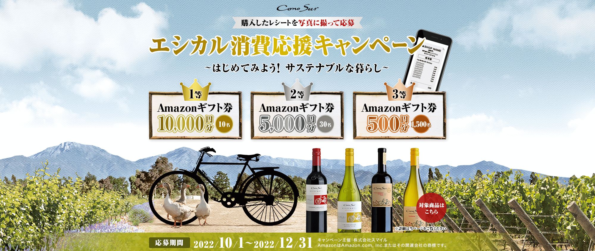 株式会社スマイル(本社:東京都江東区、代表取締役社長:大野 敦)は、コノスルワインを購入したレシートを写真に撮って応募できる、「コノスル『エシカル消費応援キャンペーン』~はじめてみよう!サステナブルな暮らし~」を2022年10月1日(土)から12月31日(土)まで開催いたします。期間中に対象ワインを購入し、レシートを写真に撮って応募すると、抽選でAmazonギフト券が当たります。