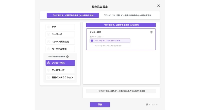 エルグラムのアクション設定でフォロー有無の絞り込みが可能に
