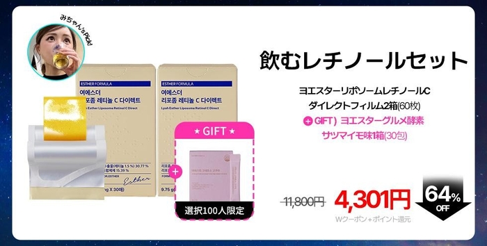 レチノールフィルムは、夏に向けて肌を内側から紫外線対策したい方に非常に人気のあるサプリメントです。このサプリメントは、紫外線によるダメージを体内から軽減することができ、肌のトーンアップや老化防止、さらには肌の再生を期待できます。今回は2個セットと大変お得に購入が可能です。さらに先着100名様限定でヨエスターグルメ酵素 -サツマイモ味もプレゼント。この機会をどうぞ、お見逃しなく!