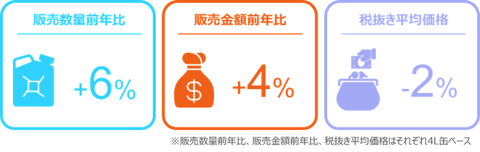 2025年2月の自動車用エンジンオイルの4L缶販売は、数量前年比6%増と堅調であった。店頭では同4%増と微増、インターネットでは同24%増と二桁成長を遂げた。4L缶の主要な粘度では、0W-20が数量前年比5%減であったが、5W-30が同6%増、10W-30は同33%増と伸長した。4L缶の税抜き平均価格は4,081円と前年同月から2%下落し、店頭では1%、インターネットでは9%下落した。4L缶全体の金額前年比は4%増となり、店頭では3%増、インターネットでは12%増であった。